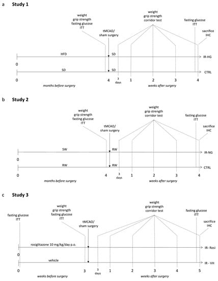 Experimental design. (a) Experimental design of Study 1: Pre-stroke IR and fasting hyperglycemia (IR-HG) were induced by chronic high-fat diet feeding. (b) Experimental design of Study 2: Pre-stroke IR, without hyperglycemia (IR-NG), was induced by 30% sucrose in the drinking water. (c) Experimental design of Study 3: Pre-stroke IR was induced by 10-month-aging and normalized by Rosiglitazone, respectively. SD = standard diet, HFD = high-fat diet, ITT = insulin tolerance test, IHC = immunohistochemistry, tMCAO = transient middle cerebral artery occlusion, SW = sucrose-supplemented water, RW = regular water.