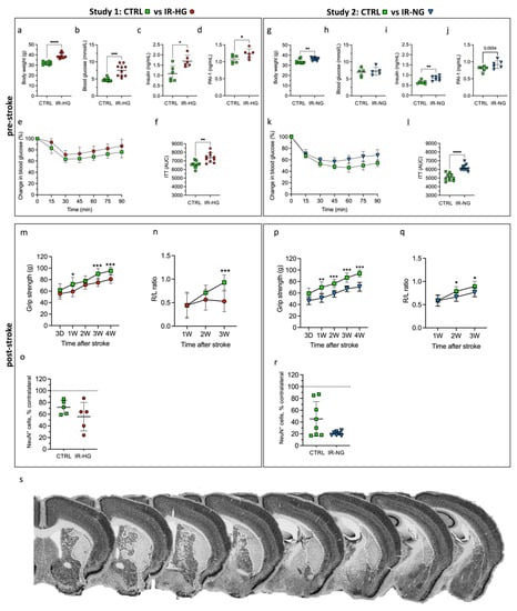 Parametric tests: For pre- and post-stroke metabolic parameters, CD68 and NeuN analysis, Welch’s t-test was used. For the behavioral tests, two-way repeated-measures ANOVA with Geisser–Greenhouse’s correction followed by Dunnett T3 was used. For Iba-1 and ChAT analysis, two-way ANOVA followed by the two-stage linear step-up procedure of Benjamini, Krieger and Yekutieli was used. All data were analyzed by GraphPad Prism Version 9.0. Data are expressed as mean ± SD. A p-value less than 0.05 was considered statistically significant.