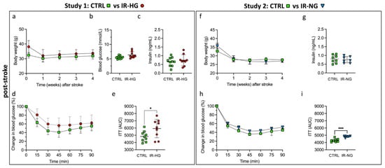 We also examined the metabolic parameters 4 weeks after stroke. Weight, glycemia and hyperinsulinemia normalized quickly in IR-HG mice, showing no significant differences versus control mice (Figure 3a–c). Insulin sensitivity also improved in IR-HG mice but the response to insulin remained diminished in IR-HG mice compared to the CTRL group, as detected by two-way repeated-measures ANOVA (diet effect: p = 0.0498) and the calculated area under the curve (Figure 3d,e). The weight also decreased in IR-NG mice, remaining similar to control mice (Figure 3f), while glycemia remained unaltered. Furthermore, hyperinsulinemia was also normalized entirely after stroke in IR-NG mice (Figure 3g). Similar to IR-HG, insulin sensitivity was improved but remained lower in IR-NG mice compared to CTRL, as detected by two-way repeated-measures ANOVA (drinking water effect. p < 0.0001) and the calculated area under the curve (Figure 3h,i).