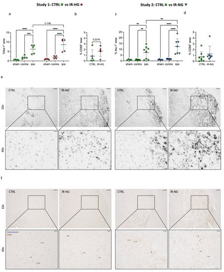 To evaluate stroke-induced inflammation, we quantified Iba-1 immunoreactivity in the ipsilateral, stroke-damaged striatum versus contralateral and respective sham mice. Stroke led to significantly increased Iba-1 in the ipsilateral striatum in all mice (Figure 4a,c,e). However, this increase was significantly greater in IR-NG mice versus CTRL (Figure 4c), while a non-statistically significant trend towards increased Iba-1 was also observed in IR-HG mice versus CTRL (Figure 4a). We also quantified the subpopulation of activated microglia expressing CD68 in the ipsilateral striatum but found no significant differences between the groups (Figure 4b,d,f).
