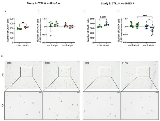 We recorded a significant increase in striatal ChAT+ interneurons in IR-HG sham mice versus healthy CTRL and a strong trend in the same direction between IR-NG and CTRL mice (p = 0.06) (Figure 5a,c). No differences were found when the contra- or ipsilateral hemispheres were compared with their respective shams in CTRL or IR-HG mice (Figure 5b,e). Interestingly, the number of ChAT+ interneurons was significantly decreased in the ipsilateral hemispheres of IR-NG compared to their respective shams (Figure 5b,e). Moreover, the number of ChAT+ interneurons in the ipsilateral striatum of IR-NG was significantly lower than in the correspondent contralateral hemisphere and the ipsilateral hemisphere of CTRL mice (Figure 5d,e).