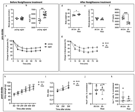 To further demonstrate the specific role of decreased insulin sensitivity in stroke recovery in a preclinical setting of clinical relevance, we utilized middle-aged mice that spontaneously developed early IR. To verify early IR in middle-aged mice, we performed a head-to-head comparison of 10-month-old vs. 1-month-old mice. The comparison showed that middle-aged mice remained normoglycemic (Figure 6a), while the response to insulin was reduced, as detected by two-way repeated-measures ANOVA (aging effect: p < 0.0001) and the calculated area under the curve (Figure 6b,c). After early IR was verified, 9-month-old middle-aged mice were randomly assigned to receive Rosiglitazone (a peroxisome proliferator-activated receptor gamma (PPARγ) and an insulin-sensitizing agent) or vehicle treatment for 3 weeks. As expected, glycemia was not affected (Figure 6e), while Rosiglitazone did improve insulin sensitivity, as detected by two-way repeated-measures ANOVA (treatment effect: p < 0.0001) and the calculated area under the curve (Figure 6f,g). Moreover, in accordance with the literature, treatment with Rosiglitazone induced a small but significant increase in body weight (Figure 6d).