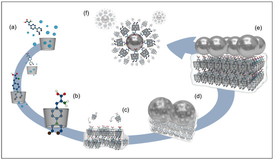 Schematic representation of nanosystem formation: inclusion process of the drug in βCD (a,b), formation of the crystals (c), obtaining and stabilization of AgNPs by magnetron sputtering (d), formation of the βCD–Mel–AgNPs crystalline system, (e) and solubilization process forming the βCD–Mel–AgNPs colloidal nanosystem (f).