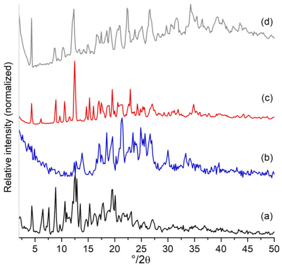 The diffraction patterns of the βCD, Mel, and the complex formed were obtained using PXRD (see Figure 2). The formation of the complex in the solid state causes the disappearance of the Mel peaks, especially in the region above 25° 2θ, maintaining a peak corresponding to βCD at 2θ angle of approximately 12°. The crystal packing arrangement of the complex was different from that of its pure species and represents a new crystalline phase, confirming the effective inclusion of the drug in the βCD matrix. Three intense peaks were observed at approximately 4°, 12° and 20° 2θ in the βCD–Mel pattern. It has been reported that the formation of complexes with a P21-type structure for βCD matrices hosting aromatic rings at 1:1 (host–guest) molar ratios also exhibit three intense peaks at equal locations. In addition, the geometrical arrangement and thus the respective diffraction pattern varies according to the type of molecular structure of the aromatic guest, according to the region partially exposed to the outside of the βCD cavity and to the water molecules contributing to the new crystalline packing [48,49,50]. Regarding the physical mixture of pure components, (Figure 2d), it was observed that its diffractogram corresponds to a superposition between the traces of the pure species.