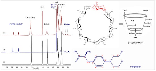 1H-NMR was conducted to study the conformation and stoichiometry of βCD–Mel and to evaluate the stability of Mel included in the complex. The latter was chosen because, in therapy, Mel has poor solubility in water and is unstable on reconstitution and dilution [44]. In 1978, Chang et al. proposed that the hydrolysis of Mel occurs in three phases where chloroethyls, one by one, are transformed into hydroxyethyls by a three-component cyclic intermediate mechanism with the tertiary amine. This process is completed after 8 h [37].
