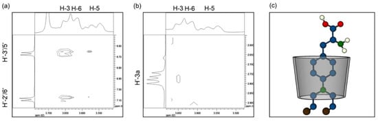 ROESY spectra of the interaction between (a) H′-2′/6′ and H′-3′/5′ of Mel and H-3, H-6, and H-5 of βCD; (b) H′-3a of Mel and H-3, H-6, and H-5 of βCD in βCD–Mel complex in DMSO-d6; (c) molecular schematic of the proposed inclusion geometry for the βCD–Mel system.
