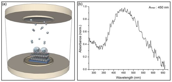 (a) Scheme of the release of atoms and formation of AgNPs on crystals of the βCD–Mel complex from the cathodic sputtering of a metal foil; (b) absorbance spectra of AgNPs deposited on βCD–Mel using magnetron sputtering.