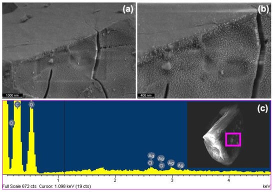 This corroborates what was previously discussed in the analysis of the samples by XRD. Figure 6a,b shows a high concentration of AgNPs of homogeneous size, preferentially accumulated on one side of the crystal, where NH2 and COOH functional groups of Mel are exposed, allowing its stabilization and confirming that the phenomenon of aggregation is widely suppressed. The EDX spectra obtained from the surface area analyzed show the atomic and weight elemental composition of the sample (see Figure 6c). The main components were carbon and oxygen; chlorine is also included, coming from the drug, and silver from the nanoparticles that remain stable in the solid state on the surface of the crystals.