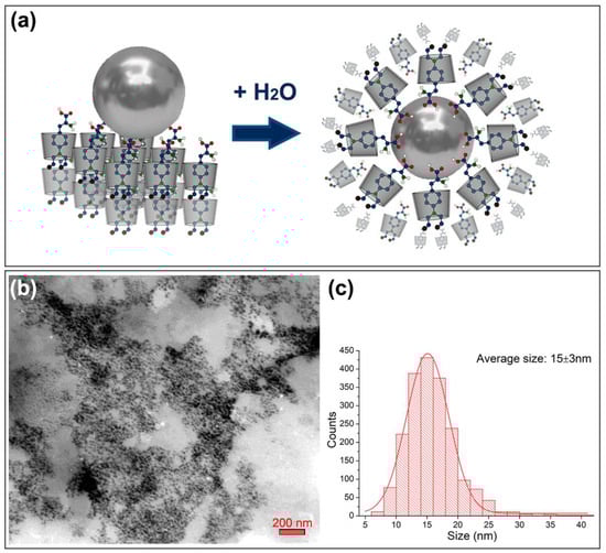 (a) Schematic representation of the solubilization process of AgNPs onto ꞵCD–Mel crystalline complex forming the ꞵCD–Mel–AgNPs nanosystem in colloidal solution, (b) TEM micrograph of βCD–Mel–AgNPs colloidal nanosystem with its respective size distribution histogram (c).