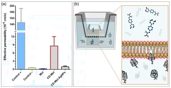 (a) Effective permeabilities of free Mel, Mel included in βCD and Mel in βCD–AgNPs nanosystem. Thiopental and Evans Blue solutions were used as negative and positive controls, respectively. The assays were performed at 37 °C for 24 h, using PBS as solvent, (n = 3); (b) representation of a transwell plate used in PAMPA with a scheme of permeation of the drug through an artificial membrane.
