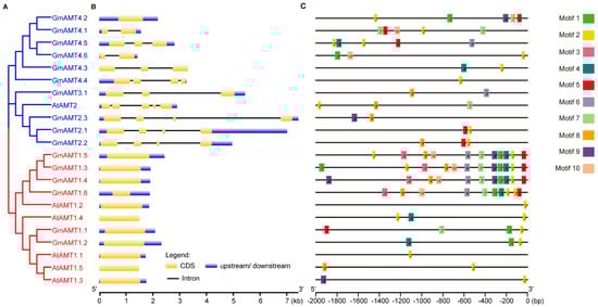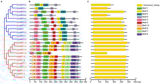 Gene structures and promoter-conserved motif analysis of the AMT family in soybean and Arabidopsis. (A) Phylogenetic tree analysis of AMTs in Arabidopsis and soybean. Maximum-likelihood trees were constructed by MEGA-X software with 1000-fold bootstrap resampling. The red and blue branches represent the AMT1 and AMT2 subfamilies, respectively. (B) Gene structure analysis of AMT genes by the GSDS 2.0 online website. The yellow boxes represent CDS regions, blue boxes represent UTR regions, and black lines represent intron regions. (C) The conserved motifs of AMT promoters in soybean and Arabidopsis were analyzed by the MEME website. Different colors represent different conserved motifs. The 2 kb promoters of AMT genes in soybean and Arabidopsis were obtained from the Phytozome database.