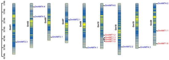 Chromosomal distribution analysis of GmAMT genes. The genome visualization tool of TBtools was used to map the chromosomal distribution of GmAMT genes. The colors of the bars indicate soybean chromosomes, and the color gradients in chromosomes represent gene density. Gene names were marked on each chromosome. GmAMT1 and GmAMT2 subfamily genes are highlighted with red and blue colors, respectively. The scale bar is presented on the left side.