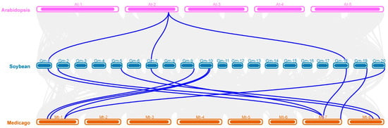 Synteny analysis of AMT genes among Arabidopsis, soybean and Medicago. One Step MCScanX on TBtools was used to analyse gene duplication. Grey lines in the background indicate the collinear blocks within the genomes of soybean, Arabidopsis and Medicago. The blue lines indicate the syntenic AMT gene pairs.