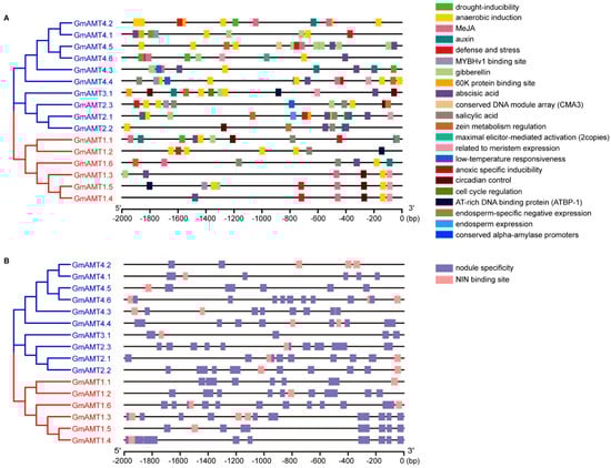 Cis-element analysis of GmAMT promoters. Sequences 2 kb upstream of the transcription initiation site were downloaded from Phytozome and used to analyze the cis-elements. (A) The cis-acting elements of 16 AMT promoters in soybean were analyzed by PlantCARE website. (B) Cis-acting element analysis of nodule specificity and NIN-binding sites in GmAMT promoters. Cis-acting elements with similar regulatory functions are indicated by the same color.