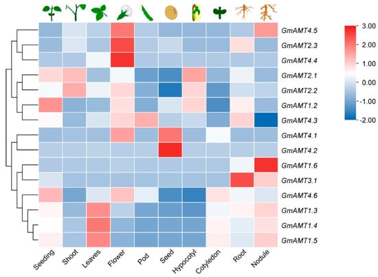 Heatmap of GmAMT expression in different tissues using RNA-seq data. The RNA-seq data were downloaded from the Soybean Expression Atlas website []. The color scale represents the normalized TPM value.