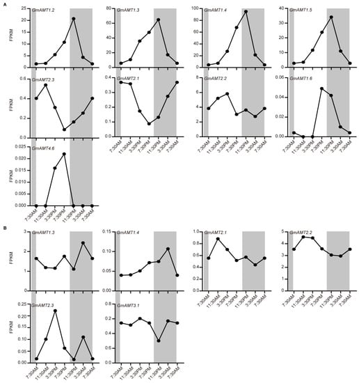 Day–night variations in gene expression of GmAMT family genes by RNA-seq data. The FPKM data of GmAMT genes were collected from the JGI Plant Gene Atlas []. The day–night expression patterns of GmAMTs in leaves (A) and nodules (B). Dark periods are highlighted as shaded columns.