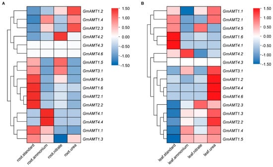 Soybeans can take up both ammonium and nitrate in soils to meet their nitrogen requirements. We assumed that the GmAMT genes are affected by both ammonium and nitrate. For this, we first analyzed the RNA-seq data from the JGI Plant Gene Atlas to determine how the GmAMT family genes respond to different types of nitrogen in roots and leaves. The GmAMT family genes showed different expression patterns in the roots and leaves of soybean plants treated with 10 mM concentrations of different nitrogen sources for 28 days (Figure 8). In roots, the expression levels of GmAMT1.2, GmAMT1.4, GmAMT2.3, and GmAMT4.2 were greatly upregulated by ammonium, nitrate, and urea, whereas the expression levels of GmAMT1.1, GmAMT1.3, GmAMT1.6, GmAMT2.1, GmAMT2.2, and GmAMT4.5 were downregulated by these nitrogen fertilizers. The expression levels of GmAMT4.1 and GmAMT4.4 were significantly upregulated under ammonium treatment (Figure 8A). In leaves, GmAMT1.3, GmAMT1.4, GmAMT1.5, GmAMT2.2, and GmAMT2.3 were upregulated under ammonium, nitrate, and urea conditions, while the expression levels of GmAMT1.6 and GmAMT4.1 were downregulated by these nitrogen fertilizers. In addition, some GmAMT genes displayed particular expression patterns in response to different forms of nitrogen. Notably, GmAMT1.2, GmAMT4.4, and GmAMT4.6 were specifically induced by urea, while GmAMT4.2 was induced by ammonium and suppressed by nitrate and urea (Figure 8B). It is apparently visible that GmAMTs showed different gene expression responses to different forms of nitrogen in the roots and leaves. These results suggest that the GmAMT genes may redundantly and coordinately control the absorption and utilization of nitrogen in soybean.