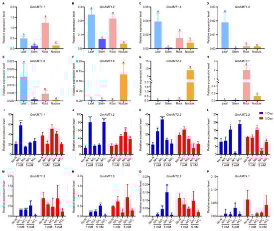 Gene expression analysis of GmAMTs in different tissues and in response to different nitrogen treatments by RT-qPCR. (A–H) Detection of GmAMT expression in leaves, stems, roots, and nodules at 24 days after rhizobial inoculation. The expression patterns of GmAMTs were analyzed in roots (I–L) and leaves (M–P) under different nitrogen sources (NH4+-ammonium nitrogen, NO3−-nitrate nitrogen, No-N: nitrogen free BD solution) and concentrations (1 mM and 5 mM) at 1 day (blue bars) or 3 days (red bars). GmELF1b was used as a reference gene. The relative gene expression levels were calculated using the method of 2-ΔΔCq to express the ratio between the GmAMTs and reference GmELF1B. The data were analyzed using student’s t-test for significant differences (*, p < 0.05; **, p < 0.01; ***, p < 0.001; ****, p < 0.0001). Different letters represent significant differences (Tukey’s test, p < 0.05).