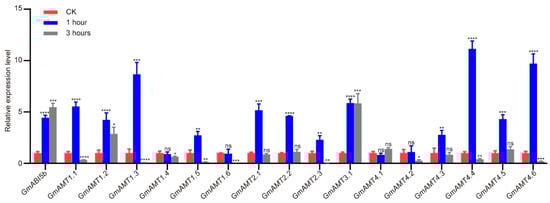 Gene expression analysis of GmAMTs in response to exogenous ABA treatment. RT-qPCR was used to analyze the expression of GmAMTs in roots treated with 50 μM ABA for 1 and 3 h. GmABI5b was used as a positive control. GmELF1b was used as a reference gene. The data were analyzed using student’s t-test for statistically significant differences (*, p < 0.05; **, p < 0.01; ***, p < 0.001; ****, p < 0.0001; ns, no significance).