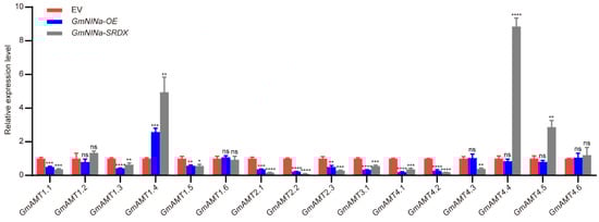 GmNINa (soybean Nodule inception a) is the key transcription factor essential for nodulation and symbiotic nitrogen fixation in soybean [,,]. Because the putative GmNINa binding sites were identified in the promoter regions of all GmAMTs genes (Figure 5B), we attempted to investigate whether GmAMTs are regulated by GmNINa during nodulation. We generated the composite plants with transgenic hairy roots overexpressing GmNINa (GmNINa-OE) and GmNINa-SRDX (GmNINa silencing) and examined the expression levels of GmAMTs during nodulation. As shown in Figure 11 and Figure S8, GmNINa showed a different influence on 16 GmAMT genes. The expression of 14 GmAMT genes was affected except GmAMT1.2 and GmAMT4.6. Among them, the expression levels of GmAMT1.1, GmAMT1.3, GmAMT1.5, GmAMT2.1, GmAMT2.2, GmAMT2.3, GmAMT3.1, GmAMT4.1, and GmAMT4.2 were significantly downregulated in both GmNINa-OE and GmNINa-SRDX transgenic roots at 3 days after rhizobial inoculation, whereas GmAMT1.4 was markedly upregulated in both GmNINa-OE and GmNINa-SRDX roots. However, GmAMT4.3, GmAMT4.4, and GmAMT4.5 exhibited different expression patterns. The expression of these three GmAMT genes remained unchanged in GmNINa-OE roots, but GmAMT4.3 and GmAMT4.4, and GmAMT4.5 were strongly down-regualted and up-regulated in the GmNINa-SDRX hairy roots, respectively. These results indicated that the majority of these GmAMTs members might function as downstream components of GmNINa in soybean nodulation.