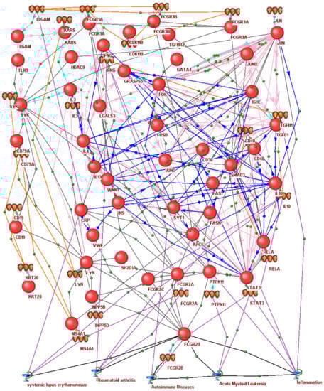 3.6. In Silico Associative Gene Network of Human Immunoregulators Homologous to the Rat Fcgr2b Gene Identified as a Molecular Marker for Pain Tolerance in ARDs