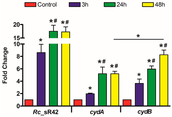 Expression profile of Rc_sR42 sRNA, cydA, and cydB coding transcripts in R. conorii during the infection of mouse endothelial (b.End3) cells in vitro. Significant upregulation of both sRNA and coding gene (cydA and cydB) transcripts was observed at 3, 24, and 48 h post-infection when compared to the control. Data are presented as mean ± SEM from three independent biological replicates. # Denotes significant changes (p < 0.05) observed between 3 h vs. 24 h and 3 h vs. 48 h. * and/or # p < 0.05.