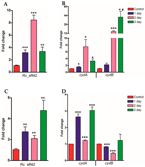 Expression profile of Rc_sR42 sRNA (A,C), cydA and cydB coding transcripts (B,D) in R. conorii during the infection of mouse lung (A,B) and brain (C,D) tissues in vivo. Significant changes in the expression of both coding (cydA and cydB) and non-coding (Rc_sR42) transcripts were observed at days 1–3 post-infection compared to the control. # Denotes significant changes (p < 0.05) observed between 3 h vs. 24 h and 3 h vs. 48 h. * p < 0.05, ** p < 0.005, *** p < 0.001.