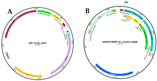 The plasmid backbone for cloning small RNA was generated by modifying the pBAD/Thio-TOPO vector (ThermoFisher Scientific, Waltham, MA, USA). Briefly, inverse PCR using primer pair pBT-F and pBT-R and pBAD/Thio plasmid as template DNA was performed to remove the HP-thioredoxin-EK site, V5 epitope, and 6X His-tag from the vector and to insert EcoRI, KpnI, and XhoI restriction sites into the modified plasmid. The amplified linear PCR product was cleaned using SV gel and PCR purification kit (Promega, Madison, WI, USA), digested with KpnI (New England Biolabs, Ipswich, MA, USA), and circularized using T4 DNA ligase (New England Biolabs, Ipswich, MA, USA). The modified plasmid containing an arabinose inducible promoter, unique restriction sites listed above, and strong rrnB terminator was verified via Sanger sequencing and named pBT_N. Full-length sRNA, either amplified from R. conorii (Rc_sR42 sRNA) or E. coli (glmZ sRNA) genomic DNA, was cloned into pBT_N plasmid backbone using the unique restriction sites, thus resulting in an sRNA expression plasmid under the tight control of an inducible arabinose promoter and strong transcription terminator. The plasmid containing the sRNA binding target gene seed region was constructed by cloning the target gene amplicon in-frame into pXG30-superfolder GFP (sfGFP) plasmid [28], which mimics an intra-operonic target arrangement (gift from Prof. Jörg Vogel, Helmholtz Centre for Infection Research, Germany). The anhydrotetracycline (aTc) inducible pXG30-sfGFP was specifically chosen for these studies as the binding region of sRNA Rc_sR42 is known to be present at the 3′ end of the cydA gene, which is expressed as a bicistronic cydAB operon in R. conorii [24,28]. Briefly, the R. conorii cydAB operonic gene fragment encoding for the last 87 amino acids of cydA and containing the predicted seed region, intergenic bases, and the first 7 amino acids for the cydB gene was amplified using the primer pair cydAB-30F and cydAB-30R and cloned in-frame into the linearized pXG30-sfGFP plasmid using NsiI and NheI restriction sites. The resulting cydAB intra-operonic plasmid had FLAG and LacZ tagged to cydA at its 5′ end and GFP tagged to cydB at its 3′ end, allowing assessment of sRNA-mediated regulation of both the genes. The E. coli glmUS, known to be regulated by glmZ sRNA, was cloned into pXG30-sfGFP plasmid as described earlier and served as the positive control [29]. The pXG1 plasmid carrying GFP directly under the control of aTc promoter served as blank positive control, while the pXG0 plasmid containing luciferase served as a blank negative control in these studies. All primers used for the generation of plasmid constructs are listed in Table S1 and plasmid maps are shown in Figure 3.