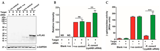 Although the generation of sRNA deletion mutants offers a direct approach for the identification of bonafide target genes, the generation of mutant strains in obligately intracellular pathogens including Rickettsia species remains a challenge largely due to the lack of appropriate genetic tools and protocols and the time-consuming, laborious procedures required for the purification and expansion of clonal populations [45]. Hence, we utilized a well-established and extensively used pXG plasmid-based reporter system to decipher the influence of R. conorii sRNA on its cognate target genes [28,46,47]. This system allows the measurement of the up- or down-regulation of the target gene through multiple ways-fluorescence, Western blotting, and/or biochemical assays. In this study, we employed two independent assays for each target gene and determined the influence of sRNA on cydA via Western blotting and the β-galactosidase assay and cydB via GFP fluorescence and Western blotting. Both assays provide conclusive evidence of the role of Rc_sR42 in the regulation of cydA but not cydB transcripts. Consistent with our observations, E. coli RyhB sRNA was shown to directly regulate cydAB during iron-limiting conditions [48].