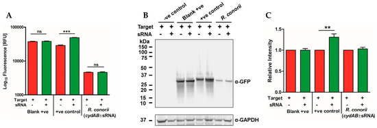 As cydAB is expressed as a bicistronic transcript in R. conorii, we tested if the expression of Rc_sR42 influences the expression of cydB. The expression of the cydB-GFP fusion protein was measured through fluorescence as well as Western blotting in the presence and absence of sRNA expression. Interestingly, sRNA expression did not influence cydB expression, and similar levels of GFP fluorescence intensity were observed in both the presence and absence of sRNA expression (Figure 5A). As expected, the E. coli sRNA GlmZ had a positive effect on the expression of GlmS and was involved in transcript stabilization and production of GlmS protein (Figure 5A). These results were further confirmed via Western blot analysis using α-GFP antibodies (Figure 5B,C).