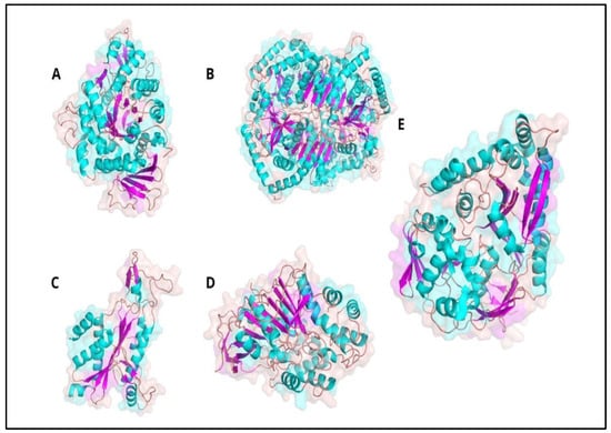 View of the OppA and its possible ligand crystal structures in the ribbon model used at this study. (A) Crystal structure of the alpha-glucosidase monomer from Saccharomyces cerevisiae S288C (Mal12). (B) Crystal structure of a tetramer of rabbit muscle Oryctolagus cuniculus, lactate dehydrogenase (LDH). (C) Crystal structure of the E. coli endonuclease dimer in complex with DNA chain (EcoRI). (D) Crystal structure of Geotrichum candidum lipase (THG). (E) Crystal structure of OppA from Yersinia pestis.