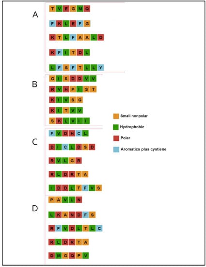 Graphic representation of the amino acid sequence of the ligands extracted from (A) the Mal 12 alpha glucosidase, (B) the A chain of the lactate dehydrogenase LDH, (C) EcoRI endonuclease and (D) THG lipase. The color code indicates the nature of the amino acid.