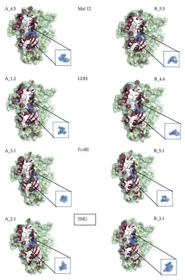 All eight ligands bind to hydrophobic zones of the corresponding enzymes, mainly beta-pleated structures, which usually have the characteristic of being buried in the protein and generate internal hydrophobic interactions (from Mal12: V, M and L; from LDH: I, V and L; from EcoRI: I, L and V; from THG: V, L and M) to provide stability to the protein and prevent interactions in its hydrophilic part which generate its splitting in combination with average hydrogen bonds of 2.8 to 3.0 Å, allowing the interaction to be flexible (Figure 4).