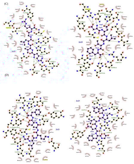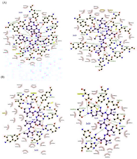 Finally, the models with the best Vina scores for each ligand were selected, i.e., the binding energy (Kcal/mol) is higher the more negative this energy value becomes. Subsequently, the PDB files of each of the results were generated, and in this way, they could be subjected to more detailed analysis in the LigPLot program to verify the interactions through 2D schemes (Figure 4).
