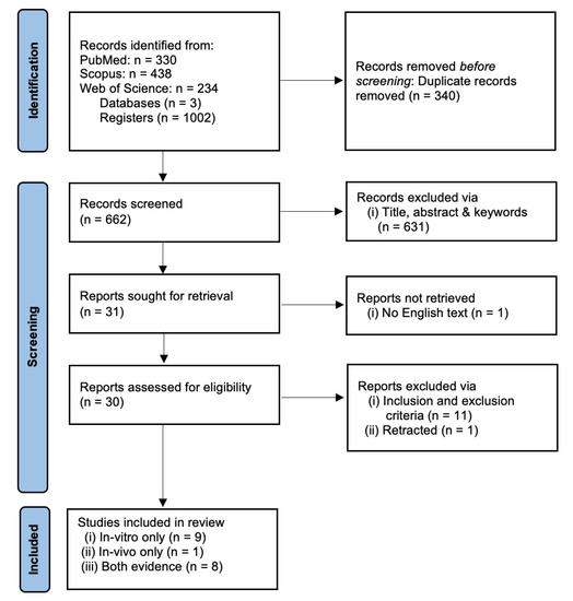 We recorded a combined total of 1002 registers from three databases: PUBMED (330), SCOPUS (438) and WOS (234). A total of 340 registers were removed as a result of duplicate merging, leaving only 662 individual registers. The first process of screening removed 631 registers based on the title, abstract and keywords. This yielded 31 suitable articles for full-text retrieval. One article was not successfully retrieved since no English-text or translation was available. A total of 30 retrieved full-text articles were screened using the inclusion and exclusion criteria stated above. Finally, 18 individual registers containing either in vitro only, in vivo only or both in vitro and in vivo evidence were selected for data extraction and analysis. The article selection was performed by two authors (A.M.L.C and J.M.C.) and any disputes in article inclusion were resolved via discussion to reach mutual consensus. The article selection process is summarized in Figure 1.