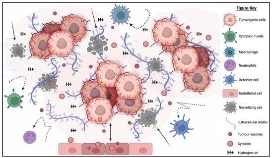 The tumorigenic cells are centered around faulty extracellular matrices, necrotic bodies, and a hypoxic and acidified microenvironment. This tumor microenvironment discourages immunoreactive cells from responding or otherwise entering the tumor to eradicate the tumor cells. At the same time, the hypoxic and acidic environment will induce cell death and exacerbate the inflammation. Moreover, tumor-derived extracellular vesicles will reprogram the host’s cells (e.g., endothelial cells) to support tumor development via increasing the secretion of growth factor, pro-angiogenic and anti-inflammatory cytokines.