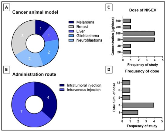 Distribution of in-vivo studies for (A) type of cancer studied, (B) administration route of NK-EVs, (C) tested dose of NK-EVs per dose and the (D) frequency of dose administered throughout study phase. Numbers indicated in (A,B) refers to the frequency of reviewed studies that fall into the categories.