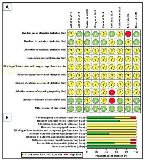 SYRCLE’s risk of bias tool: (A) scoring of individual studies; (B) overall scores presented as percentage of studies for in-vivo studies [45,46,47,49,50,53,60,90]. Symbols: yellow “?” indicates unclear risk; green “+” indicates low risk; and red “-” indicates high risk of bias.