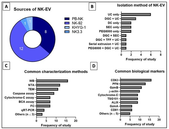 Distribution of reviewed studies for (A) source, (B) isolation techniques (single or combined), (C) common characterization assays and (D) common biological markers for NK-EVs. Numbers indicated in (A) refer to the frequency of reviewed studies that fall into the categories.