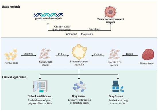 Overall, PDAC is the most mature field of pancreatic organoids because preclinical research and clinical discovery have synchronously forged ahead. The related basic research includes investigations of the microenvironment and tumour initiation, whereas the established model has been applied to build a biobank for drug screening and personalized medicine. Currently, the main research areas related to pancreatic cancer organoids include the establishment of an organoid model of PDAC, the construction of models from normal cells using CRISPR-Cas9 technology, and the establishment of an organoid biobank for precision medicine for pancreatic cancer [30]. With respect to pancreatic cancer organoids, we will address this topic from the perspectives of cancer initiation and progression and discuss directions for future clinical applications. The overall application of organoids shown below in Figure 2.