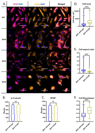 Immunocytochemical and morphological characterization of obtained glioma early-passage cell cultures. Asterisks indicate level of statistical significance: ** p ≤ 0.01, *** p ≤ 0.001 and “ns” p > 0.05. (A) GFAP and beta-3-tubulin immunostaining. Scale bar is 100 um. (B) Beta-3-tubulin labeling intensity comparison in IDH1 wild-type and IDH1 R132H mutant early-passage cell cultures. (C) GFAP labeling intensity comparison in IDH1 wild-type and IDH1 R132H mutant early-passage cell cultures (D) Surface area comparison of IDH1 wild-type and IDH1 R132H cell cultures. (E) IDH1 wild-type and IDH1 R132H cell aspect ratio comparison. (F) Cell roundness of IDH1 wild-type and IDH1 R132H cultures.