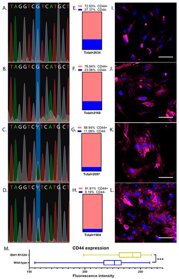 IDH1 sequence chromatograms and CD44 immunostaining of early-passage glioma cell cultures (P-4). Laser scanning microscopy with equal image acquisition parameters. Blue color is for DAPI, and red is for CD44. Scalebar is 100 um. (A) Sequence chromatogram for BT1 cell culture, IDH1 wt; (B) Sequence chromatogram for BT40 cell culture, IDH1 wt; (C) Sequence chromatogram for BT32 cell culture, IDH1 R132H mutant; (D) Sequence chromatogram for BT39 cell culture, IDH1 R132H mutant; (E) Fraction of CD44+ cells in BT1 cell culture; (F) Fraction of CD44+ cells in BT40 cell culture; (G) Fraction of CD44+ cells in BT32 cell culture; (H) Fraction of CD44+ cells in B391 cell culture; (I) CD44 labeling of BT1 cells; (J) CD44 labeling of BT40 cells; (K) CD44 labeling of BT32 cells; (L) CD44 labeling of BT39 cells; (M) CD44 labeling intensity comparison of IDH1 wild-type and IDH1 R132H mutant early-passage cell cultures. Asterisks indicate level of statistical significance: *** p ≤ 0.001.