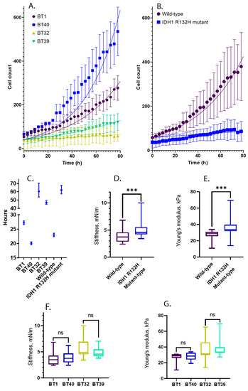 Cell proliferation rate for R132H mutant and wild type cell cultures. Asterisks indicate level of statistical significance: *** p ≤ 0.001 and “ns” p > 0.05. (A) Growth curves for the each analyzed cell culture; (B) Growth curves for the cell cultures grouped by the presence of IDH1 R132H mutations; (C) Cell doubling time calculated for the each analyzed cell culture and clustered cell cultures by the presence of IDH1 R132H mutation; (D) The comparison of the stiffness collected from whole populations of the cells from the IDH1 R132H cell cultures vs. wild type cell cultures. (E) The comparison of the Young’s modulus collected from whole populations of the cells from the IDH1 R132H cell cultures vs. wild type cell cultures. (F) The comparison of the cell stiffness measured from specific cell lines. (G) The comparison of the cell Young’s modulus measured from specific cell lines.