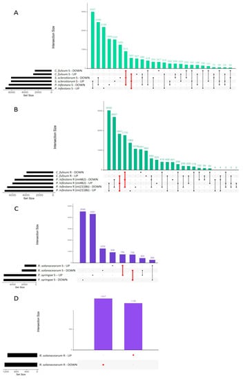 The intersection of up and down DEGs induced by tomato genotypes infected with fungi and bacteria (first 30 intersections). (A) Susceptible genotypes infected with fungi. (B) Resistant genotypes infected with fungi. (C) Susceptible genotypes infected with bacteria. (D) Resistant genotype infected with bacteria. In red are DEGs with the same expression trend in all the analyzed datasets.
