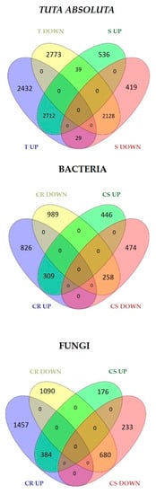 Private DEGs identified in R and S genotypes to fungi, bacteria, and Tuta absoluta. CR = common DEGs among R genotypes; CS = common DEGs among S genotypes; T = tolerant; S = susceptible genotypes.