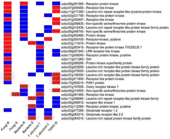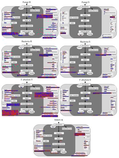 Genes putatively involved in biotic stress response under fungi, bacteria, TSWV, and T. absoluta infections. Blue: upregulated, red: downregulated genes. R = resistant; S = susceptible; T = tolerant genotype.