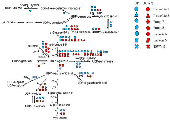 Other important enzymes involved in pectin metabolism were found DE under various biotic stress. In particular, a PG (Solyc08g060970) and a UGE (Solyc02g030230) were induced by R genotypes to fungi and bacteria. Similarly, the R genotypes to bacteria showed the downregulation of Solyc12g010540. By contrast, a different UGE (Solyc07g043550) was activated by bacteria S genotypes and repressed by the T. absoluta T genotype.