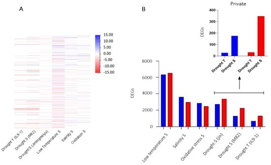 (A) Heatmap of DEGs induced during different abiotic stress; (B) Number of DEGs induced by different abiotic stress with a focus on private DEGs induced by tolerant and susceptible genotypes to drought. Blue = Upregulated and Red = Downregulated. R = resistant; S = susceptible; T = tolerant genotype.