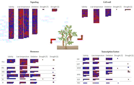 Differences in TFs regulation included ERFs, which were mainly induced during salinity and oxidative stresses, while Solyc07g054220 (ERF2a) was also upregulated by the drought T genotype. In addition, the drought T genotype showed the activation of various NAC genes, including Solyc01g009860. Different WRKYs were upregulated during salinity, low temperature, oxidative stress, and in S genotypes to drought. On the other hand, the T genotype to drought showed the downregulation of Solyc07g055280 (WRKY78).