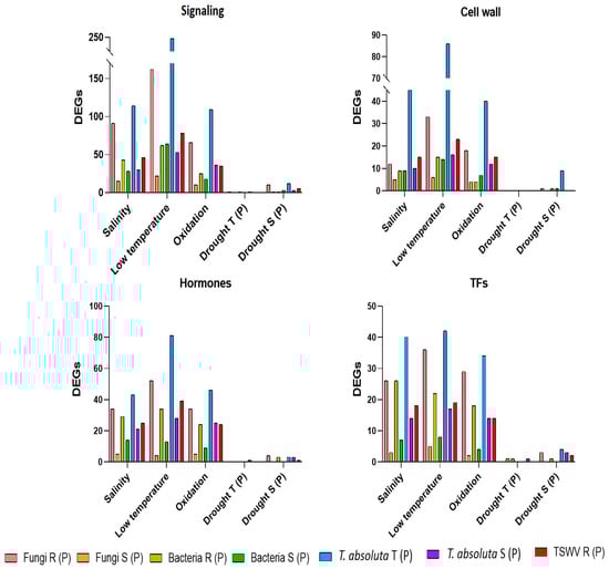 Comparing lists of private DEGs obtained for each group of biotic (fungi, bacteria, TSWV and T. absoluta) and abiotic stress (drought, low temperature, salinity, and oxidative stress), we identified common genes related to signaling, cell wall, hormones, and TFs, activated or repressed under different stresses. Generally, the R genotypes to pathogens showed a higher number of common DEGs with abiotic stresses than their S counterparts for most of the gene classes (Figure 8). An exception was the identification in R and S plants to bacteria of a similar number of common DEGs, involved in the signaling and cell wall process, with low temperature stress. Due to the low number of private DEGs in T and S genotypes to drought, few genes were identified in common with biotic stress (Figure 8) and have been reported in Supplementary Table S4.